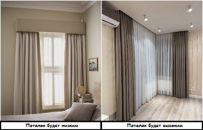 Чтобы потолки казались выше, повесьте длинные шторы в пол. Подбирайте вариант из струящейся ткани, чтобы он ниспадал вниз красивыми складками и добавлял интерьеру легкости. Отлично будет смотреться двухслойный комплект с полупрозрачными портьерами или легким тюлем.