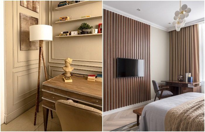 Далее переходим к светильникам. Должен быть центральный источник света, например, компактная и лаконичная люстра, а также локальные светильники – споты, бра, торшеры и пр. Последние служат для подсветки конкретных функциональных зон. Если у вас натяжной потолок, подумайте о том, чтобы пустить по периметру мягкую подсветку. Так вы сможете добиться эффекта парящего потолка и визуально приподнять его.
