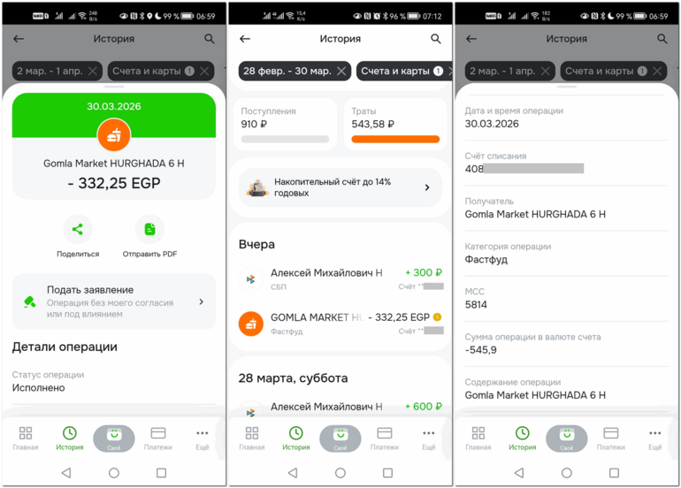 Для проверки, я оплатил покупку в Гомле на 332.25 фунта 30 марта 2026 года. Сначала баланс карты уменьшился на 543.58 руб, после того, как через три дня операция провелась, сумма операции изменилась на 545.9 руб.