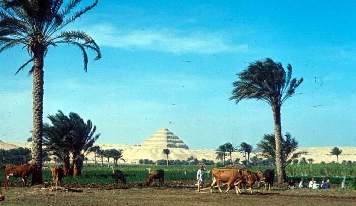 Фермер пашет поле, Ступенчатая пирамида Джосера на заднем плане. Фотограф: Eliot Elisofon, 1965 год