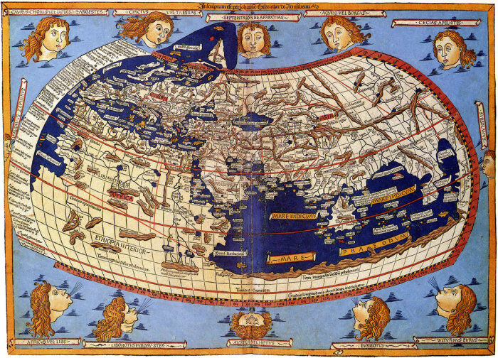 Очень похоже изобразил такое представление о мире священник-энциклопедист Исидор Севильский в своем труде «Этимологии» (VII в.). В форме буквы «Т» изображено море, а буквой «О» обозначен океан. И здесь уже есть Африка.