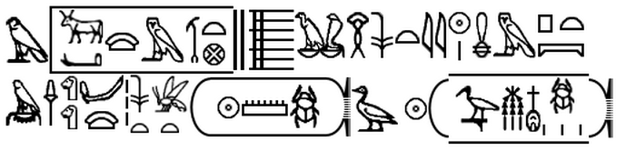 Вот как звучал целиком титул фараона Тутмоса III: «Гор, Могущественный Бык, Возникающий в Фивах; От обеих Владычиц, Возносящих в царском сане, Подобен Ра в небесах; Золотой Гор, Сильнейший из сильных, Священный явлением; Бог Двух Земель, Неизменный, явленный как Ра; Сын Ра, Тутмос, наипрекраснейший».