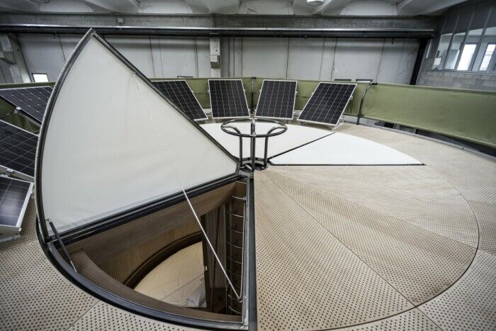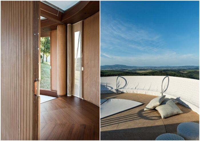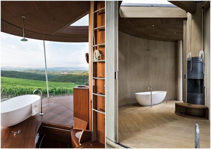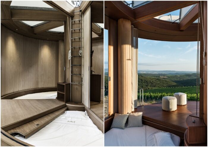 Особенные конструкционные моменты коснулись и организации пола. Оказывается, проектом предусмотрена раздвижная секция напольного покрытия, которая открывает спальную зону в нужное время и обеспечивает доступ в туалет, полностью скрытый из виду. Еще одним интересным внедрением станет цилиндрическая сердцевина, в которой установлен дровяной камин с дымовой трубой, обеспечивающий теплом в холодную пору. Сбоку же можно увидеть еще и лестницу, ведущую к террасе на крыше.