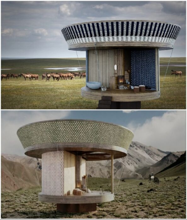 При этом можно обеспечить и вполне уединенное место для отдыха, стоит только задействовать нужные механизмы и внутри появится спальня, гостиная, мини-кухня, ванная комната, туалет и терраса. Если имеется желание любоваться природой или звездным небом лежа на кровати, можно не закрывать только определенную часть стен и потолка домика, чтобы никто не потревожил покой. Когда же захочется устроить вечеринку с кучей гостей, то стены и перегородки полностью убираются, создавая открытый шатер. По задумке креативного архитектора, вариантов организации пространства масса, все будет зависеть от климатической зоны, погодных условий, времени года, настроения или цели, для которой приобретается динамичный домик-юрта.