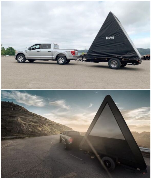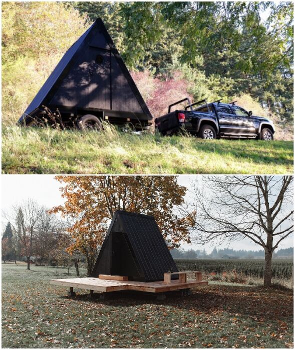 Для «растворения» мобильной хижины в природном ландшафте дизайнеры Bivvi Camp выбрали черный цвет фасада (Bivvi Cabin). | Фото: autoevolution.com.