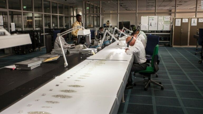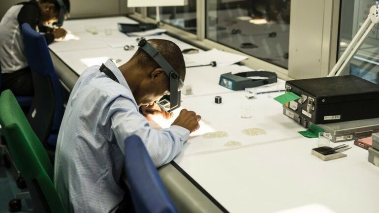 Работники компании De Beers осматривают алмазы.