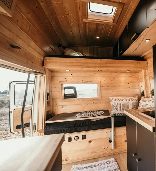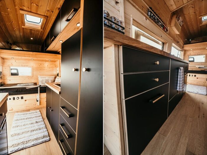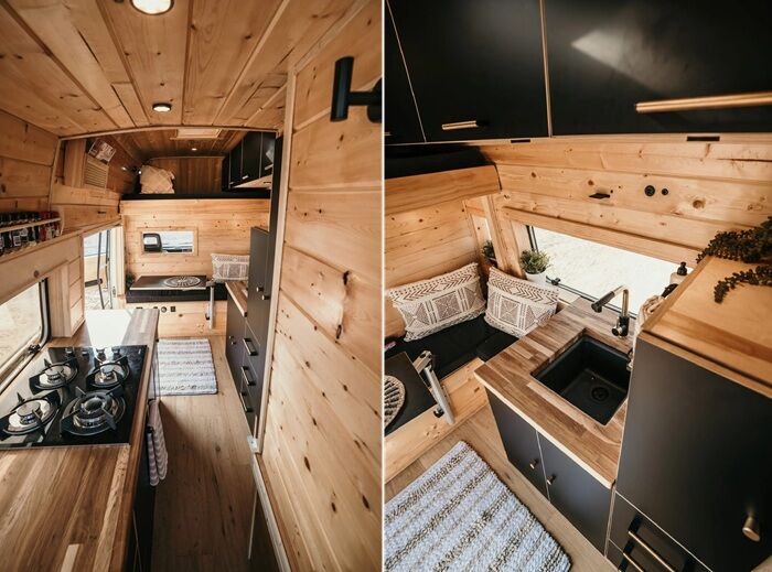 За счет обилия окон, натурального тона древесины и высоты потолка, само убежище получилось не таким уж и тесным, как могло бы показаться, глядя со стороны на миниатюрный автофургон. Продуманная до мелочей планировка, изготовленная под нужные размеры мебель, использование небольших размеров бытовой техники позволили оптимизировать каждый миллиметр имеющейся площади без ущерба для условий жизни.