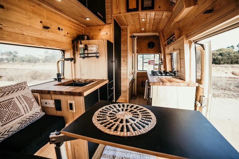 Это многофункциональная зона, которую занимает кухня, столовая/домашний офис, гостиная и спальня. Чтобы путешествующие могли не отказывать себе в горячей пищи и домашних блюдах, с одной стороны находится кухня, оборудованная всем необходимым для приготовления полноценного обеда или ужина. Встроенный кухонный гарнитур, разделенный на две секции, дает возможность содержать в порядке посуду, гаджеты, столовые приборы, запасы продуктов питания, чая, кофе и специй, а также закрепить на столешницах четырехконфорочную варочную панель, большую мойку с краном (и проточной водой), а заодно спрятать мини-холодильник.