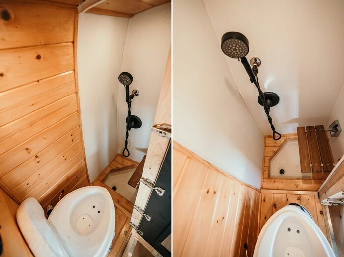 Примечательно: Скромные размеры не помешали оборудовать и полноценную ванную комнату. Она изготовлена из натурального дерева и полностью изолирована от жилого пространства. В ней установлены: душевая, ограниченная лишь немного утопленным поддоном, решетчатым столиком-полкой и душевой лейкой. Здесь же имеется и биотуалет. Ванна организована по принципу мокрой зоны, но когда останавливаешься в лесной глуши, то такие неудобства становятся совсем не существенными.