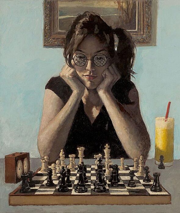 По признанию художника, картина была задумана как упражнение на пирамидальную композицию, но вышла за его рамки. Молодая девушка участвует в турнире (об этом говорят часы возле доски). Её азарт и погружённость в процесс переданы интересным визуальным приёмом: доска отражается в её очках – словно стоит у неё в глазах. На губах шахматистки играет лёгкая улыбка удовольствия: партия только началась, и всё впереди.