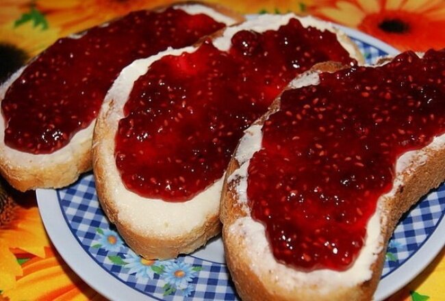 Любимое лакомство и сегодня. Батон, намазанный маслом и вареньем (обычно малиновым или смородиновым).