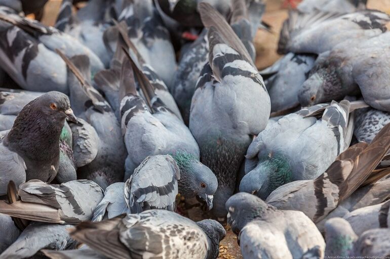 Рядом всегда сидят несколько продавцов с тарелками крупы и кукурузы, так что при желании птиц можно покормить.