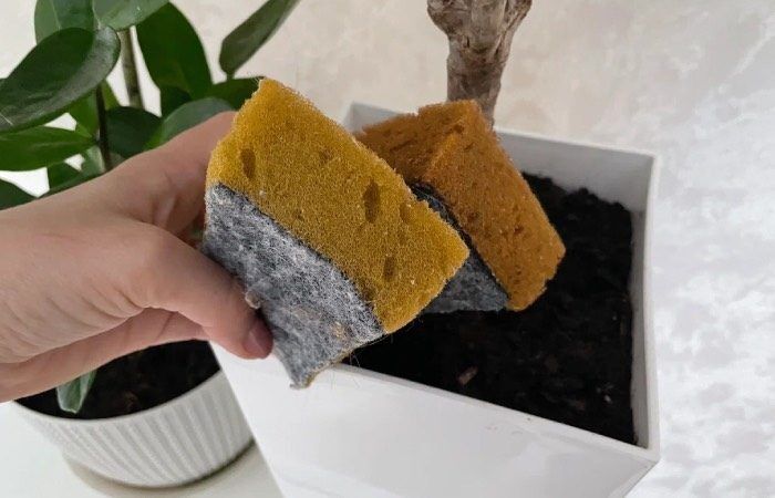 Для того чтобы организовать отложенный полив цветов, необходимо несколько губок на одно растение. Хорошенько смочите их в воде и разместите в горшок с цветком. Таким образом, губка постепенно будет испускать воду, а значит, ваше растение не засохнет в течение нескольких дней.