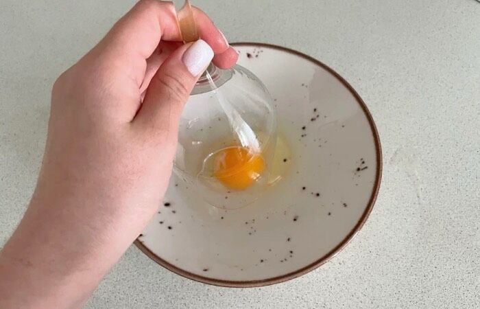Как ни удивительно, но поможет нам приготовить отличную глазунью самый обычный бокал. Для начала необходимо разбить яйцо на тарелку. После чего бокалом накрываем желток, а вилкой взбиваем белок, оставшийся по краям. Далее именно в таком виде переливаем яйцо на сковородку и поджариваем. Поверьте, глазунья получится с идеально круглым желтком.
