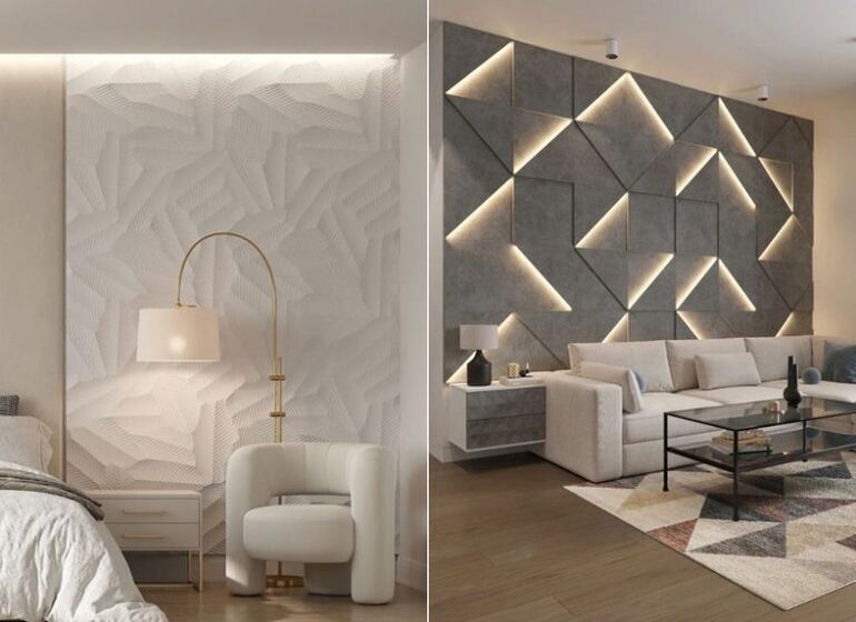 — Гипсовые 3D-панели — узор становится сложнее. Вместо простой геометрии — волны, капли, органические формы, напоминающие застывшую воду или дюны.