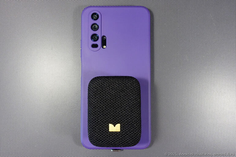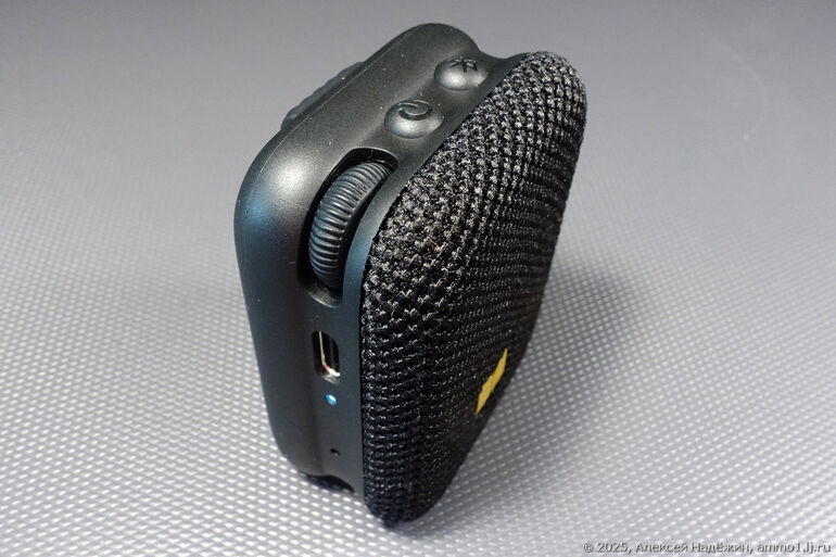 Сзади у колонки мощные магниты (можно "прилепить" её на холодильник или другой металлический предмет) и магнитная клипса для крепления на рюкзак или одежду. Сверху кнопки включения и сопряжения. На боку разъём зарядки Type C, индикатор, отверстие микрофона (колонку можно использовать для громкой связи при разговоре по телефону). На углу - колёсико-энкодер для регулировки громкости.
