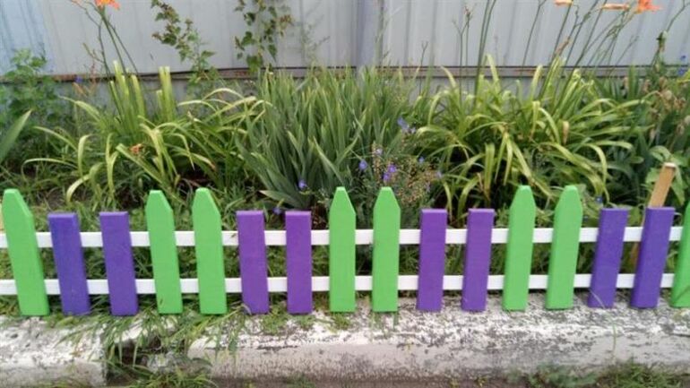 Такой низким штакетник тоже можно сделать самостоятельно, имея элементарные навыки работы с доской. И выкрасить можно как угодно. Классика ограждения клумбы в чистом виде.