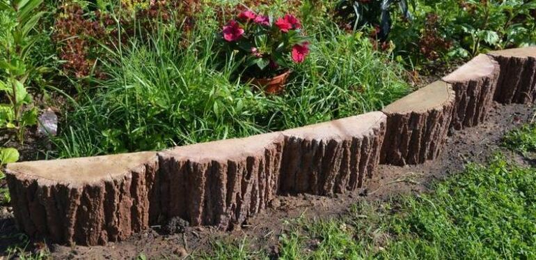 Целые спилы дерева или их половинки тоже станут достойным обрамлением клумбы. Это натуральный материал, который тоже желательно защитить от внешних воздействий. В остальном никакой обработки такие спилы не требуют, ведь красивы сами по себе, даже с корой.