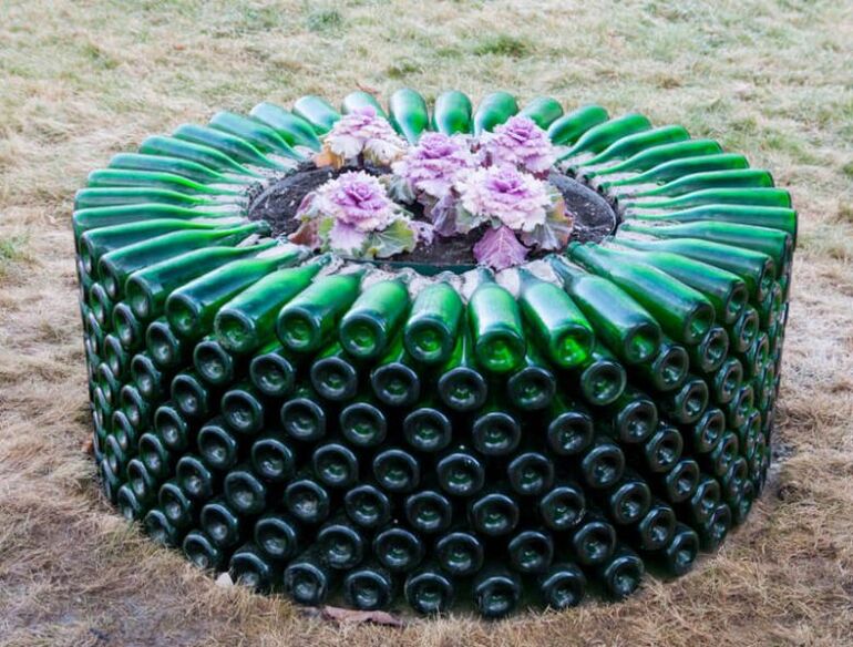 Бутылочная клумба. Почему нет? Если уж из бутылок дома строят, почему бы не сделать клумбы, насобирав нужное количество такого доступного материала. Если вы закапываете бутылки вертикально, обязательно заполните песком или землёй для большей устойчивости. А в случае горизонтальной укладки потребуется цементный раствор для скрепления слоёв.
