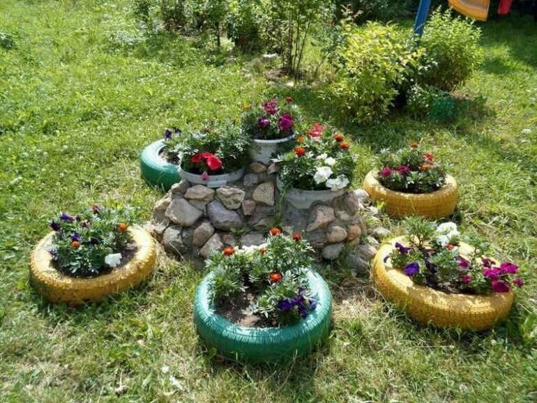 И, конечно, российская классика оформления клумбы своими руками — старые шины, покрышки. Дёшево, удобно, практично, можно покрасить и придать декоративный эффект.
