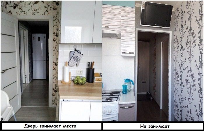 Казалось бы, какую еще дверь можно установить на кухне вместо классической распашной? Однако, по мнению дизайнеров, они является чуть ли не самым худшим из возможных решений. Такая дверь требует места для открывания, поэтому она делает маленькую кухню еще более тесной.