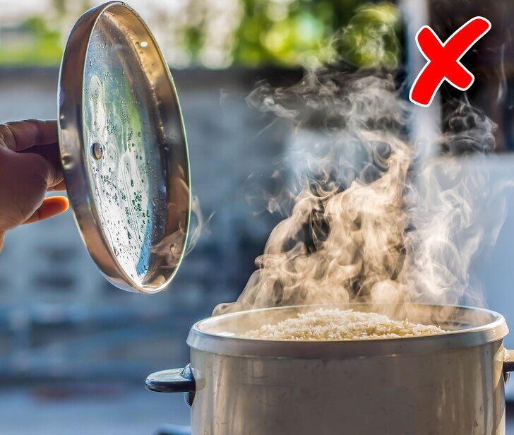 6. Поднимать крышку при приготовлении риса
