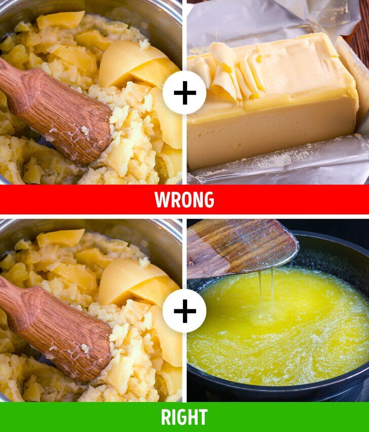Добавление этих ингредиентов в холодном состоянии предотвратит их надлежащее поглощение крахмалом в картофеле. Поэтому лучше разогреть сливочное масло до тех пор, пока оно не растает, а сливки — до тех пор, пока они не начнут выделять пар, и только тогда вы должны добавить их.