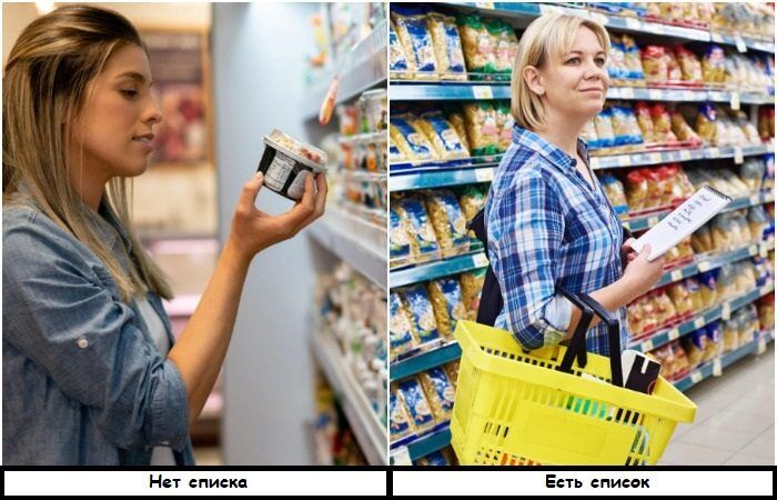 Планировка супермаркетов – очень хитрая штука. Они построены таким образом, чтобы самые нужные отделы находились в конце. Вот почему вам приходится пройти десятки рядов, чтобы добраться до молока, хлеба или мяса. По пути вы минуете сладости, различные снеки, сладкие напитки, таблички «1+1=3». В таком хаосе легко забыться и положить в корзину то, что вам на самом деле не нужно. А список помогает собраться с мыслями и четко следовать плану.