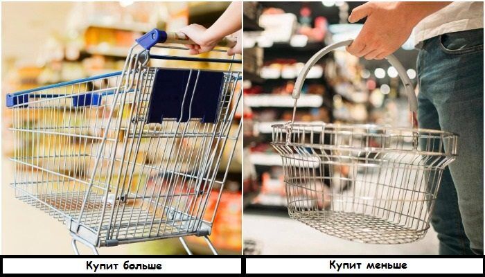 Вы знали, что чем больше тара у вас в руках, тем больше денег вы тратите? А маркетологи знают, и активно этим пользуются. Поэтому на входе в супермаркет стоит так много больше тележек. Они на колесиках, и кажется, что с такой тарой будет удобнее, чем с корзинкой в руках. Но на самом деле это хитрая уловка, которая заставляет покупать больше. Пустая тележка психологически требует заполнения, ведь мозг не может смириться с пустотой.