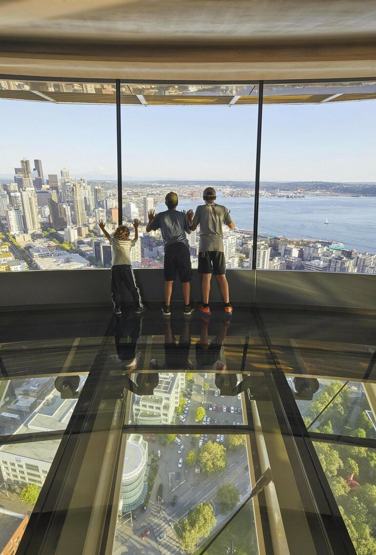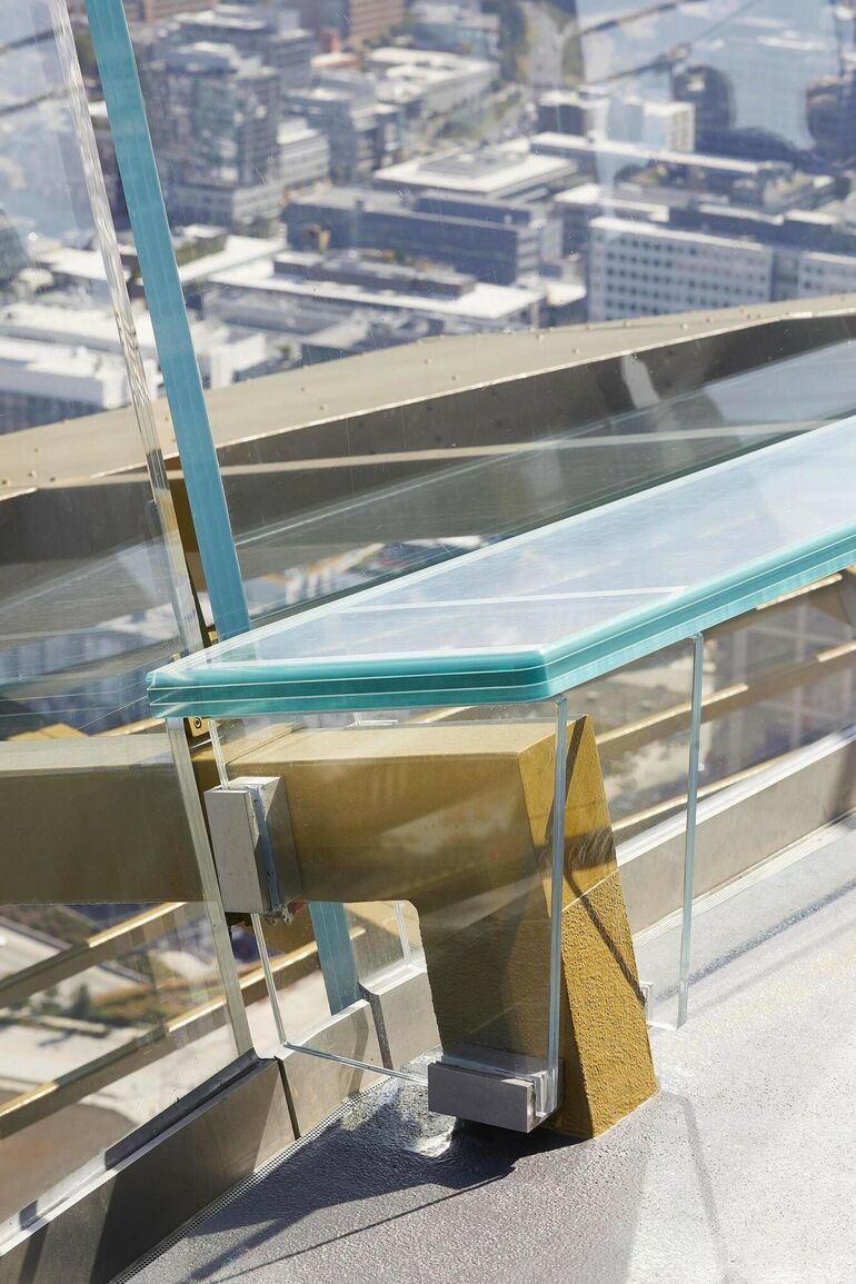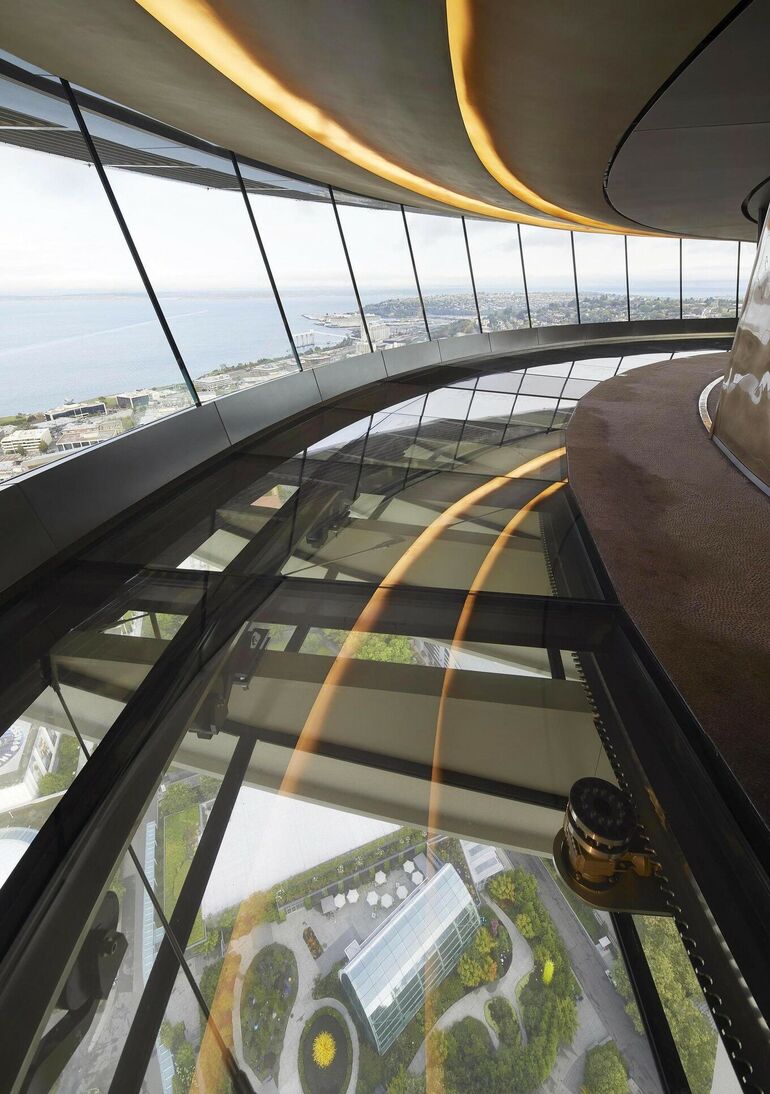 В новом дизайне Спейс-Нидл использовано на 196% больше стёкла, чем раньше, поэтому 1,3 миллиона посетителей получают совершенно новые физические и эмоциональные ощущения, определяемые впечатляющими видами на залив Пьюджет и городские панорамы. В обновлённой башне установлен первый и единственный в мире пол из вращающегося стекла. Посетители могут ходить, стоять или сидеть на стеклянном полу на высоте 159 метров. Видимым стал новый кинетический механизм, обеспечивающий вращение пола. Новые стеклянные барьеры со встроенными стеклянными скамьями позволяют гостям облокотиться и испытать ощущение полёта над городом. Благодаря отсутствию стен, швов и стоек между стеклянными панелями гости могут наслаждаться беспрепятственным видом на город и его окрестности. Несмотря на то, что башня Спейс-Нидл выглядит практически неизменной снаружи, обновлённые системы здания и значительно улучшенные впечатления посетителей переносят в будущее, сохраняя её наследие для будущих поколений.