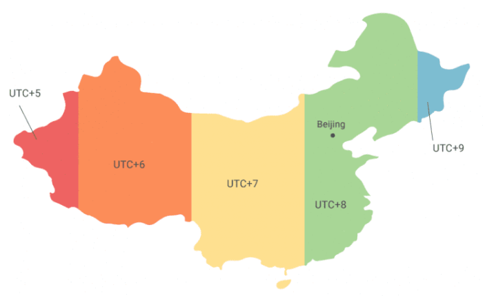 КНР от других стран отличается многим, в том числе и вопросом времени в прямом смысле этого слова. Здесь во временном вопросе не действуют ни научные, ни мировые законы. Отсчитываются часы исключительно по административному внутреннему регламенту. Везде одно и то же время суток. И это при том, что страна расположена в пяти часовых поясах. Власти КНР оставили UTC+8 – единый для всей государственной территории часовой пояс.
