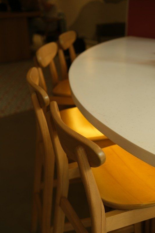 Овальный или круглый стол визуально объединяет людей. Это особенно актуально для открытых планировок.