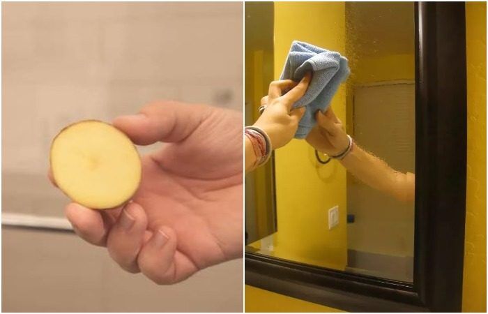 Чтобы устранить пятна от зубной пасты, брызги от воды и прочие загрязнения хозяйки используют сырой картофель. Да-да, вы все правильно поняли – оказывается, овощ отлично очищает зеркала. Но это еще не все – также картофель помогает защитить поверхность от запотевания. Нужно лишь разрезать плод на две части и одной половинкой протереть зеркало. Благодаря высокому содержанию крахмала в картофеле, он создает на поверхности защитную пленку, который препятствует образования конденсата.