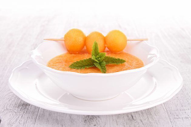 В сотейнике растворите сливочное масло и мёд. Нарежьте мяту и добавьте к сливочно-медовой массе, чтобы она отдала аромат. Смажьте этим куски дыни и обжарьте их на гриле в течение 3–5 минут. В процессе обжарки можно продолжать поливать дыню медово-мятным соусом.Гаспачо из дыни