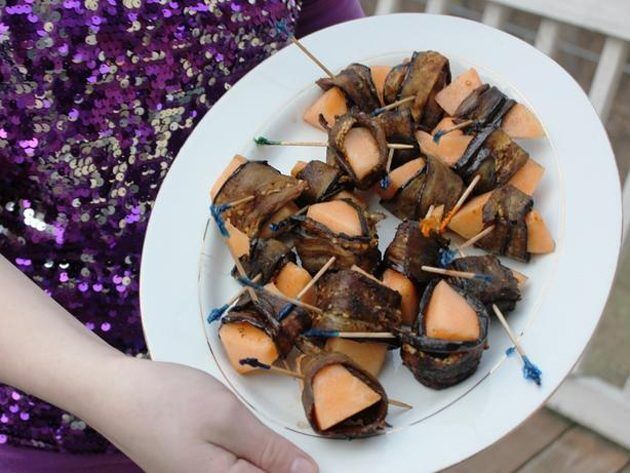 Для этих рулетов хорошо подойдёт мускусный сорт дыни. Нарежьте плод на трёхсантиметровые кубики. Оберните каждый из них полоской баклажана и закрепите рулет шпажкой или зубочисткой.