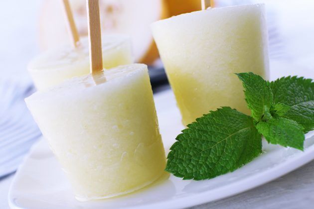 Измельчите мяту и выжмите сок из лаймов. Соедините эти ингредиенты, а также сахарную пудру и ром в блендере и взбейте на большой скорости. Разбавьте эту смесь холодной водой и тщательно перемешайте.Нарежьте дыню на небольшие ломтики, залейте их получившимся коктейлем и отправьте на полчаса в холодильник. После этого каждый ломтик насадите на шпажку и поместите в морозильную камеру ещё на 30 минут. Подавайте к столу сразу же, пока не растаяло.