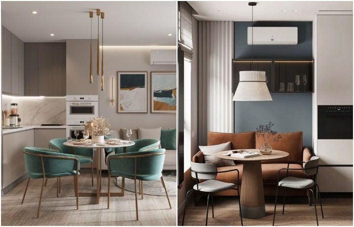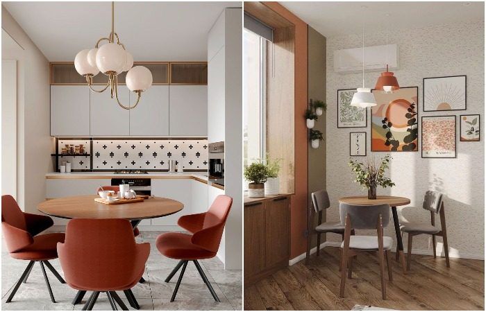 Но если форма нестандартная, есть ниши, углы и прочие элементы, которые мешают сделать все правильно, тогда придется чем-то пожертвовать. Например, вместо массивных стульев можно установить компактный диванчик и пару табуретов, которые будут прятаться под стол. А в качестве гарнитура рассмотрите угловую модель, чтобы с пользой задействовать имеющуюся площадь.