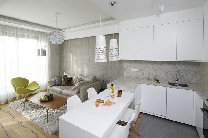 Речь идет о планировке комнаты. Если вы объединяете кухню с гостиной, важно подумать, сколько места вы сможете выделить для одной зоны, сколько – для другой, и останется ли еще свободная площадь, например, для мини-кабинета. Отлично, если комната в квартире изначально прямоугольная – тогда вы сможете пропорционально разделить ее на две части и разместить все необходимое.