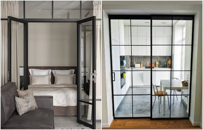 Если же нужно отделить кухню-гостиную от спальни (обычно это актуально для студий), тогда потребуется тяжелая артиллерия в виде стены. Но чтобы она не выглядела громоздко и не делала квартиру визуально меньше, позаботьтесь о наличии широкого проема и стеклянной двери, которые подарят композиции легкость и воздушность. Для удобства и экономии места выбирайте не распашную, а раздвижную дверь. Это важно для небольшой площади, где высоко ценится каждый метр.