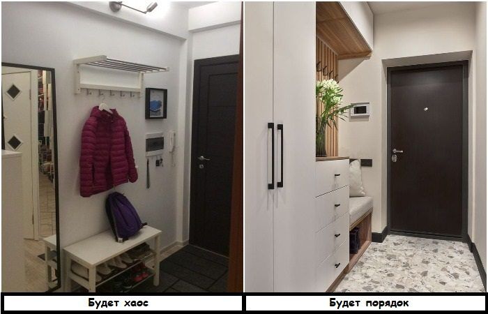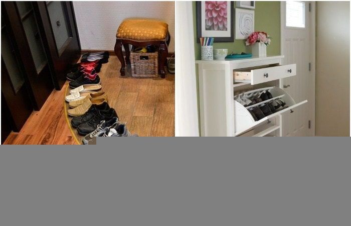 Главный источник беспорядка в прихожей – это обувь, которая остается стоять около двери. Обычно она хаотично разбросана по комнате, но даже если вы выставите ее вдоль стены «под линеечку», ситуацию это особо не спасет – все равно в комнате будет царить визуальный шум.