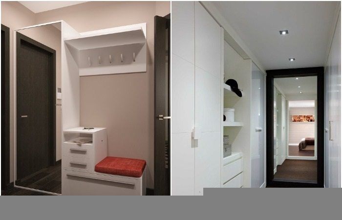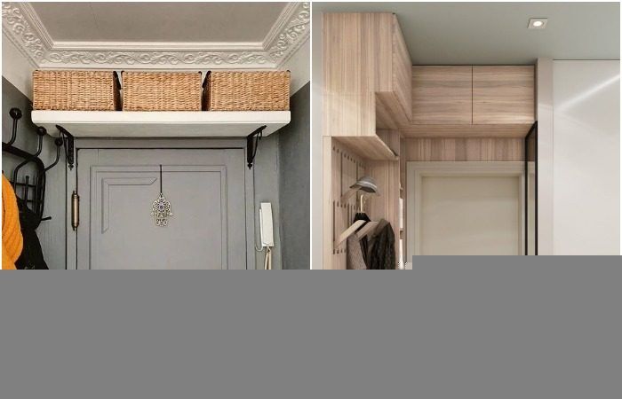 Обычно пространство над дверью пустует, но в случае с маленькой прихожей, где важен каждый метр – это непозволительная роскошь. Чтобы сэкономить место и увеличить объем хранения, разместите над входной или межкомнатной дверью антресольную конструкцию. Сюда можно будет убирать вещи, которые не нужны вам каждый день, например, сезонную одежду, инвентарь для уборки, запасной текстиль, новогодний декор и пр. Важно, чтобы полка совпадала по цвету с дверью или стеной, иначе она будет выглядеть слишком громоздко и перегружать пространство.
