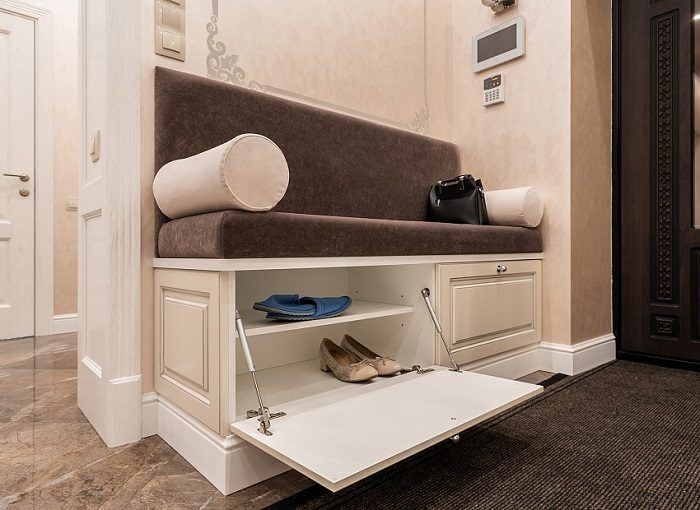 Нужно помнить о том, что размер прихожей почти всегда очень маленький, поэтому для соблюдения порядка важно наполнять ее многофункциональными вещами. Одной из них может стать скамья с отсеком для хранения. В стандартном виде она будет служить местом, где можно присесть, но как только вы откроете крышку, то сразу найдете нишу для хранения шапок, перчаток, зонтов и прочих аксессуаров.