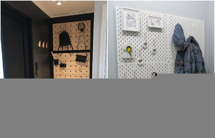 Предлагаем повесить такую панель и в прихожей. Чтобы не занимать место на стене, разместите ее на входной двери. Добавьте крючки, рейлинги и другие элементы, которые необходимы для комфортной организации хранения, и заполните пегборд вещами. Это могут быть ключи, перчатки, зонты и прочие предметы, которые зачастую лежат, где попало и создают беспорядок.