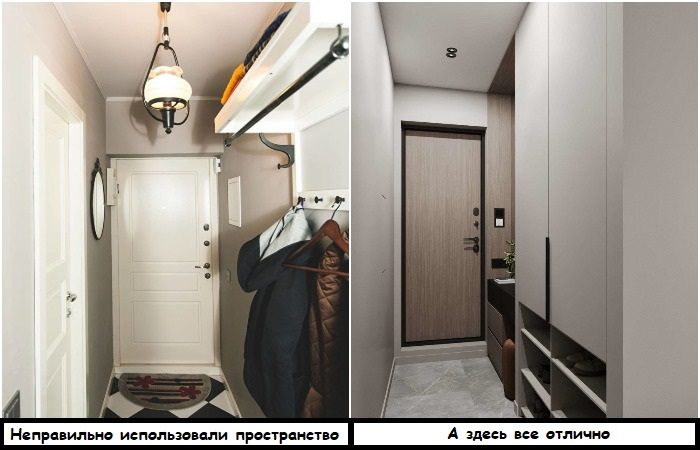 Коридоры в хрущевках не отличаются большими габаритами, и в них очень сложно развернуться. Хорошо, если прихожая хотя бы квадратная – тогда в ней можно без проблем разместить нужную мебель. Но если коридор узкий, ситуация становится совсем плачевной. Как вариант – установить зеркало на всю стену, чтобы комната визуально стала шире. Также следует убрать всю громоздкую мебель и заменить ее более компактными изделиями. Например, вместо напольной вешалки повесьте на стену крючки, а вместо массивной тумбы – узкую высокую обувницу.
