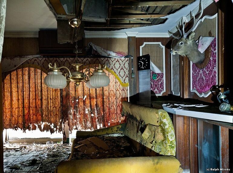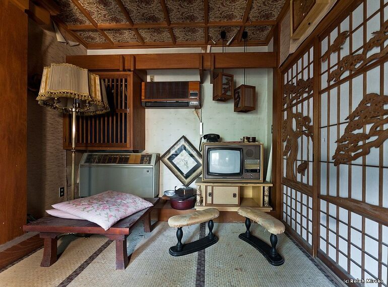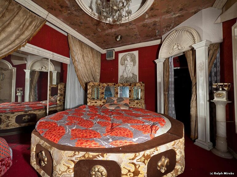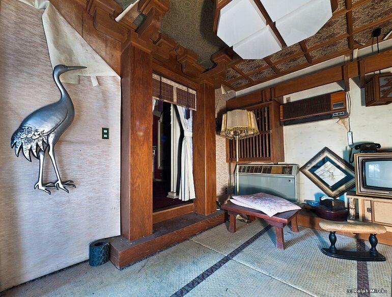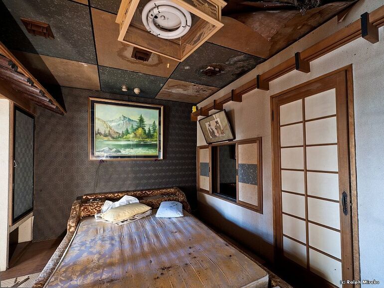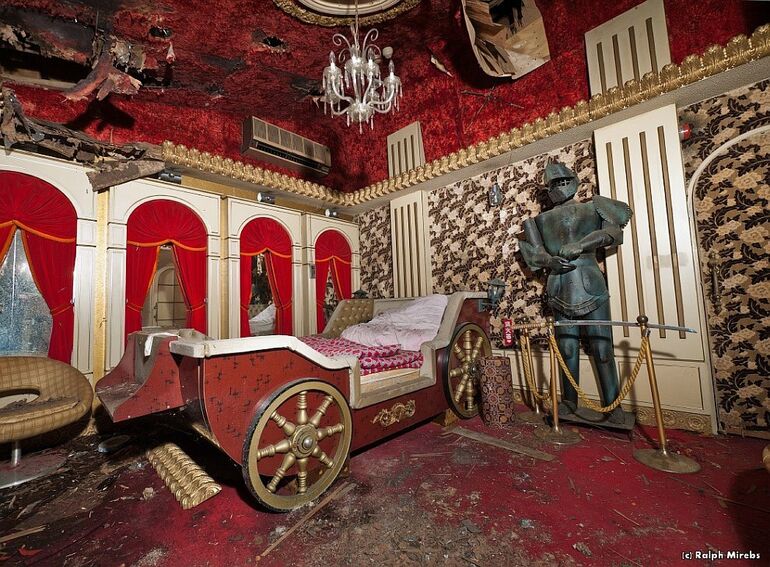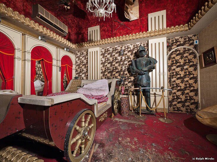 Япония. Заброшенный отель. Двухэтажное здание на 10 номеров. На первом этаже большой гараж, из каждого бокса которого идет узкая лесенка непосредственно в номер. Здесь нет центрального холла, и в номере можно остановиться и жить совершенно не встречаясь с другими постояльцами. Этот отель был открыт в 1973 году, закрыт в 1997-ом. Но самое интересное в нём — оформление номеров. Такой необычный декор характерен для специальных love-отелей, которых по всей Японии великое множество.
