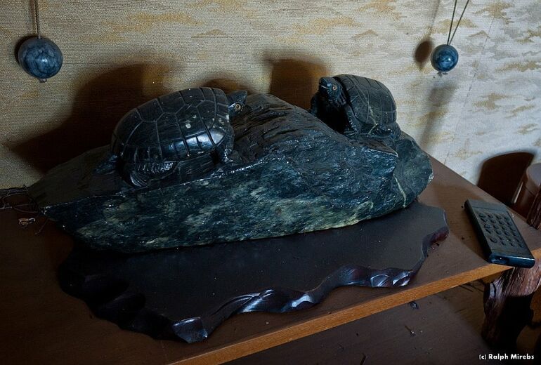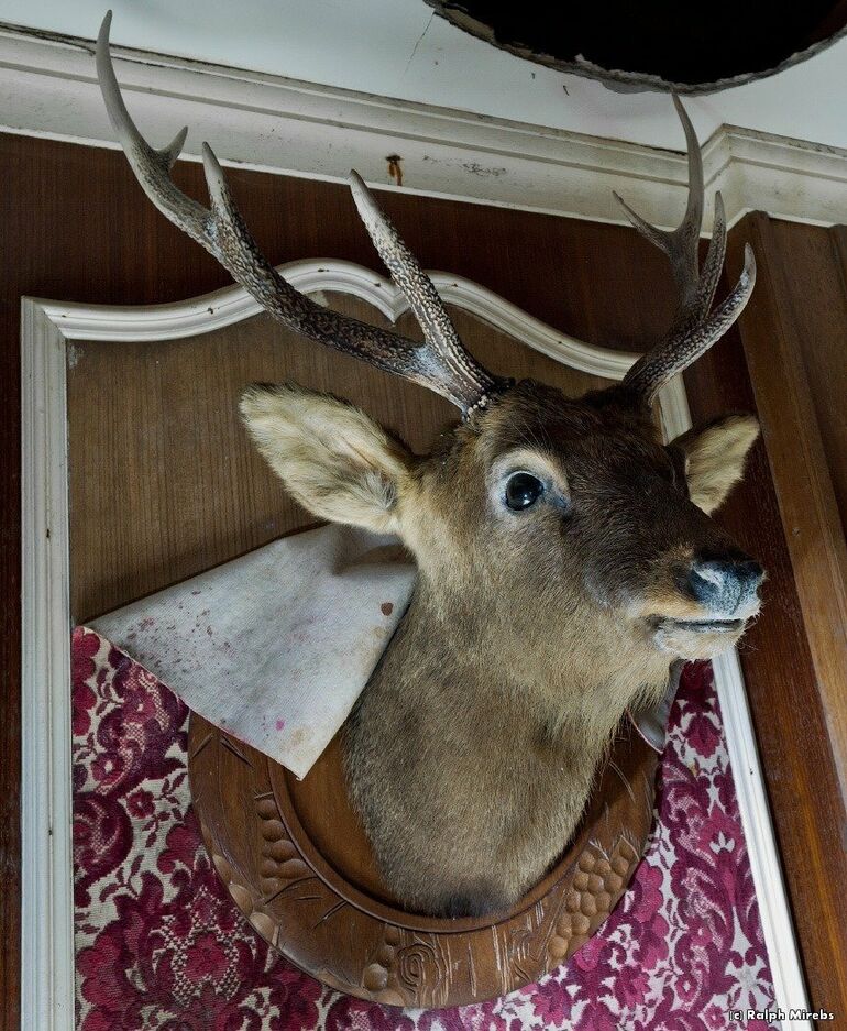 А вот этот номер представляет собой комнату охотника. Крыша, к сожалению, за 15 лет прохудилась, диван изрядно подмочило водой, а трухлявый пол того и гляди провалится: