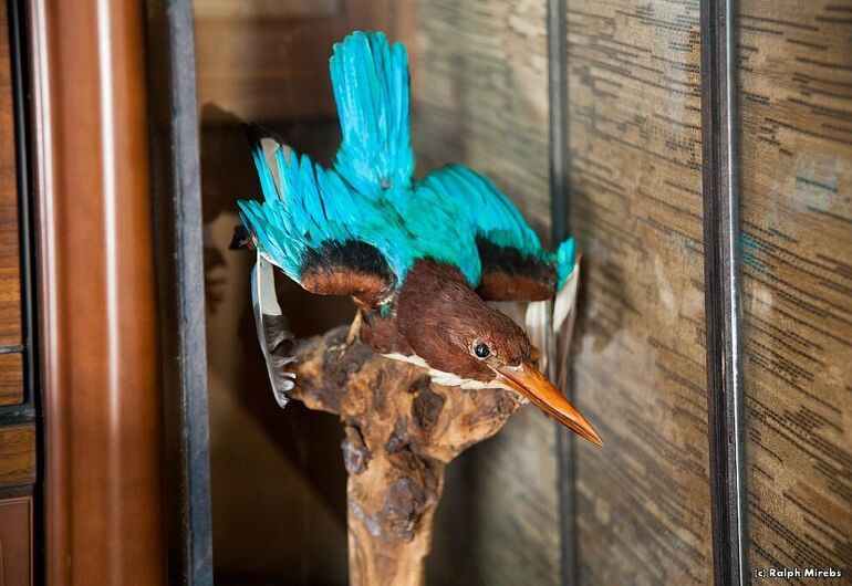 Ещё один номер с интерьерными элементами и чучелом птицы. Двери справа ведут в небольшую ванную комнату, туда же можно открыть и окно из комнаты: