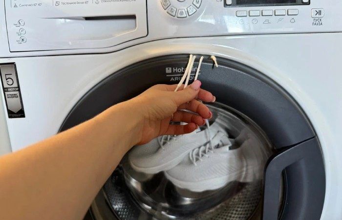 Главная проблема при стирке кроссовок состоит в шнурках. Именно они обычно спутываются или вовсе застревают в стиральной машинке. Чтобы этого точно не произошло, просто воспользуетесь нашим советом, и все пройдет отлично. Помещая кроссовки в барабан машинки, оставьте шнурки снаружи. Просто высуньте их через дверцу и закройте ее. Это поможет избежать спутавшихся шнурков, а также обувь больше не будет болтаться по всему пространству барабана. Так что для кроссовок это тоже выгодно. Больше никакой деформации при стирке.