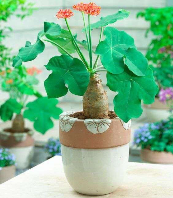 Еще один цветок, имеющий необычный вид. Растение привлекает внимание и клубневидным стволом, и яркими цветами. В странах Африки и Азии используется в качестве живой изгороди. При этом Ятрофа весьма токсична. так как содержит ядовитое вещество фитотоксин курцин. При проглатывании оно вызывает обезвоживание, сердечно-сосудистую недостаточность и даже смерть. Кстати, переработанное масло семян растения используют в качестве топлива в дизельных двигателях.