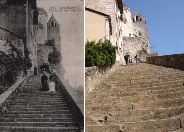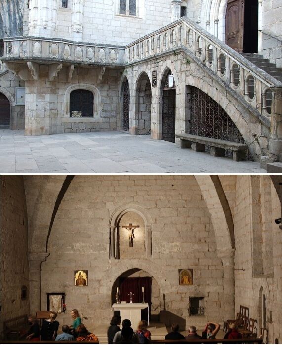 Интересный факт от Novate.ru: Чтобы узнать, как в Средневековье и позже паломники поднимались в храмы Рокамадура, современникам достаточно спуститься по диагонали от Оспиталета к входным воротам Рокамадура в окружении сувенирных лавок, магазинчиков и небольших кафе. Этот путь под названием Voie Sainte (Святой путь), считался священной дорогой, которая ведет к старинным воротам Порт-дю-Фигье (построены в XIII веке) и открывал доступ к главной улице городка, где находится святилище (все основные церкви и часовни). И паломники преодолевали его особым образом. Перед входом они снимали часть одежды, и на оголенных коленях поднимались по каменным ступеням (а их более 200), каясь в своих грехах и произнося молитвы. Особо фанатичные еще больше истязали себя, они вешали на шею тяжелые железные цепи, усложняя путь.